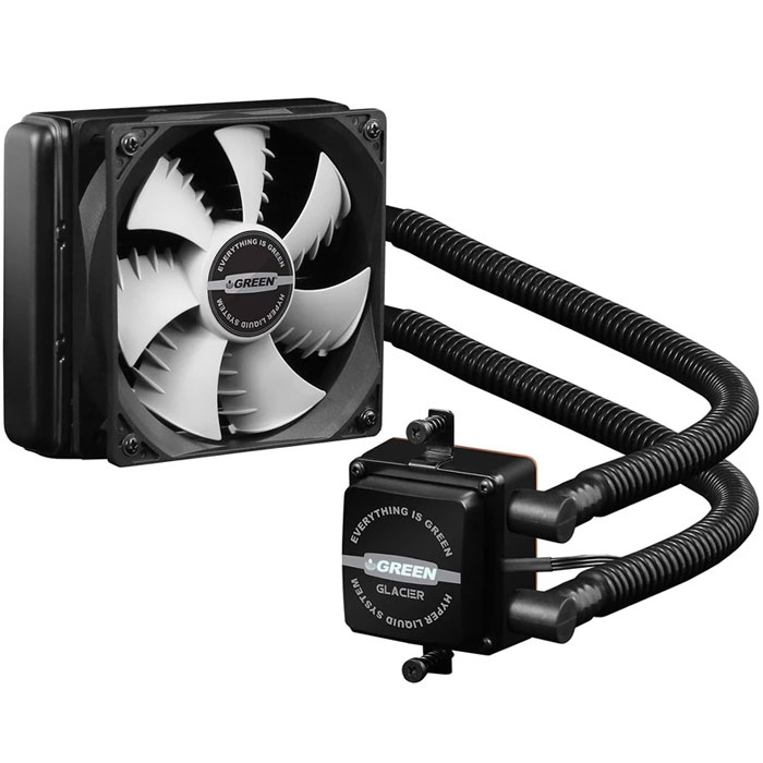 خنک کننده پردازنده مرکزی Glacier GLC120A شرکت گرین (Green)، یک خنککنندهی آبی است که از سیستم حلقه بسته (Closed Loop) استفاده میکند. در این خنککننده، از یک رادیاتور آلومینیومی 120 میلیمتری استفاده شدهاست که به نوبهی خود، سهم به سزایی در دفع گرمای پردازنده ایفا میکند. روی این رادیاتور آلومینیومی، یک عدد فن 120 میلیمتری استفاده شدهاست که هوای گرم وارد شده به درون رادیاتور را خنک کرده و به سمت منفذهای خروجی کیس هدایت میکند. بلوک تماس با پردازنده (CPU) از جنس مس خالص ساخته شده که کاملا با پردازنده در تماس است و مایع خنککننده پس از عبور از روی این بلوک تماس، به سمت رادیاتور انتقال داده میشود. بلوک تماس به وسیلهی یک جفت لولهی پلاستیکی از جنس FEP به طول 30 سانتیمتر به رادیاتور وصل میشود و میتوان فاصلهی مناسبی بین پردازنده و رادیاتور ایجاد کرد تا عملکرد هر یک از این اجزا، بر دیگری تاثیر منفی نداشتهباشد. این خنککننده را میتوان روی پردازندههای حرفهای و نیمه حرفهای از هر دو برند Intel و AMD نصب کرد و با ایجاد محیطی خنکتر برای پردازنده، طول عمر آن را افزایش داد. به کمک چنین خنککنندهای میتوان پردازندههای حرفهای را تا حدود زیادی اورکلاک هم کرد که این عمل، خود به رسیدن به کامپیوتری قدرتمندتر منجر میشود. درون بستهی این محصول، کفشکهای نصب روی سوکتهای مختلف قرار داده شدهاست که باعث میشود در نصب آن با مشکلی مواجه نشوید. به علاوه، یک عدد خمیر حرارتی (خمیر سیلیکون) هم همراه با محصول ارایه شده تا اتصال بهتری بین بلوک تماس و پردازندهی مرکزی برقرار شود و گرمای پردازنده به شکل موثرتری انتقال داده شود. این سیستم خنککننده را میتوان برای انجام اورکلاکهای منطقی تهیه کرد یا از آن برای ایجاد شرایطی بهتر از خنککنندههای مرجع برای پردازندهها استفاده کرد.