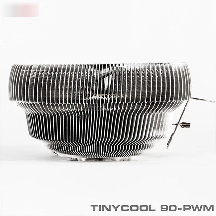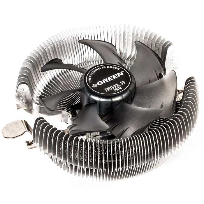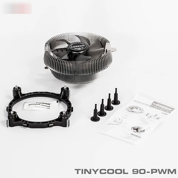 خنککنندهی پردازندهی مرکزی «Tiny Cool 90PWM» شرکت گرین (GREEN)، یک خنککنندهی بادی است که از یک فن 90میلیمتری از نوع Hydraulic Bearing با نهایت سرعت چرخش 2200 دور بر دقیقه، همراه با هیتسینک آلومینیومی Flower Heat-Sink و بیس هیتسینک آلومینیومی از نوع Direct Touch تشکیل شده است؛ همچنین طراحی خاص Base هیتسینک این کولر بهگونهای است که تیغههای آلومینیومی این بخش با فشردگی بسیار زیاد مستقیما با سطح IHS پردازنده تماس دارند. درواقع در این کولر، با حذف Base، حرارت بدون هیچ واسطهای به طور مستقیم جذب و به تیغههای آلومینیومی منتقل میشود. میزان نویز تولیدشده توسط این فن 21 دسیبل است. فن بهکاررفته در این خنککننده، انرژی موردنیاز خود را از سوکت 4 پین تأمین میکنند. خنککننده Tiny Cool 90PWM با سوکت انواع پردازندههای شرکت اینتل (Intel) و AMD سازگاری دارد. اگر قصد تهیهی یک سیستم خنککنندهی CPU حرفهای ولی با قیمت مناسب را دارید، Tiny Cool 90PWM محصول مناسبی برای شما خواهد بود. همانطورکه از نام این محصول پیداست، از کنترل سرعت فن (PWM) بهره میبرد. به کمک این ویژگی هرگاه دما در پردازندهی مرکزی افزایش یابد، فن با سرعت بیشتری میچرخد.