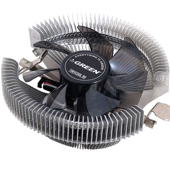 امروزه با پیشرفت تکنولوژی در ساخت تراشهها و مخصوصا پردازندههای مرکزی که در ابعاد کوچک و قدرت پردازش بالا عرضه میشوند، تعبیه یک سیستم خنک کننده مناسب نیزکاملا ضروریست.خنک کننده ها در حالت کلی به دو دسته بادی (Air Cooling) و آبی (Water Cooling) تقسیم میشوند. خنککننده پردازنده مرکزی TinyCool-90 شرکت گرین (GREEN)، یک خنککننده بادی است که از یک فن 120 میلیمتری از نوع Hydraulic Bearing با نهایت سرعت چرخش 2000 دور بر دقیقه،همراه با هیتسینک آلومینیومیFlower Heat-Sink و بیس هیتسینک آلومینیوی از نوع Direct Touch تشکیل شده است.فن خنککننده TinyCool-90 میتواند جریان هوای 43.4 فوت مکعب بر دقیقه را از پردازنده به هیتسینک اتقال دهد.همچنین طراحی خاص Base هیتسینک این کولر ارزان قیمت بهگونهای است که تیغههای آلومینیومی در این بخش با فشردگی بسیار زیاد مستقیماً با سطح IHS پردازنده تماس دارند. در واقع در این کولر با حذف Base حرارت بدون هیچ واسطهای مستقیماً جذب و به تیغههای آلومینیومی منتقل میشود. میزان نویز تولید شده توسط این فن 22 دسیبل است. فن بکار رفته در این خنک کننده انرژی مورد نیاز خود را از سوکت 3 پین تأمین میکنند. خنک کننده GREEN TinyCool-90 با سوکت انواع پردازنده های شرکت اینتل (Intel) و AMD سازگاری دارد.