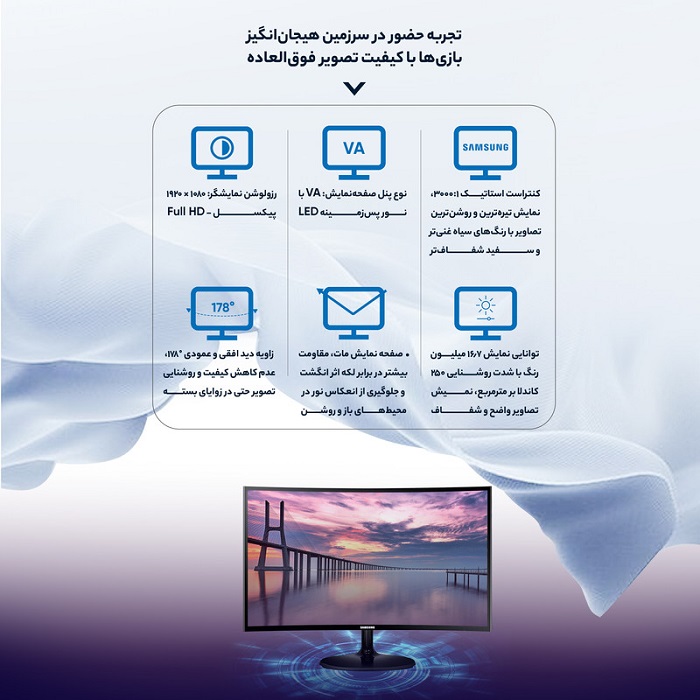 Samsung MagicBright Samsung MagicUpscale Eco Saving Plus حالت محافظ چشم صفحه نمایشی با انحنای ۱۸۰۰R Game Mode FreeSync