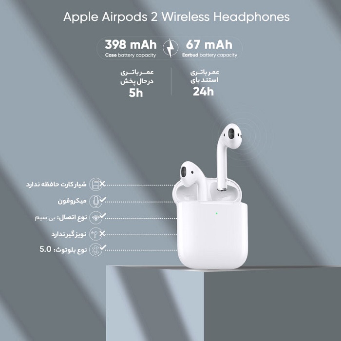 مجهز به چیپست Apple H۱ ۲ برابر سریعتر در اتصال به ابزارآلات ۱.۵ برابر سریعتر در برقراری تماس تلفنی دارای سنسور اپتیکال و شتابسنج قابلیت پخش تا ۲۴ ساعت (با محاسبه ظرفیت محفظه باتری) عمر باتری در حالت پخش مداوم موسیقی برابر با: ۵ ساعت عمر باتری در حالت مکالمه: برابر با ۳ ساعت توانایی پخش ۳ ساعت موسیقی یا ۲ ساعت مکالمه با ۱۵ دقیقه شارژ سازگار با macOS ۱۰.۱۴ ،iOS ۱۲.۲ یا watchOS ۵.۲ و بالاتر امکان شارژ بیسیم ندارد پارت نامبر: BCG-A۲۰۳۱ و BCG-A۲۰۳۲ نام داخلی: B۲۸۸AP